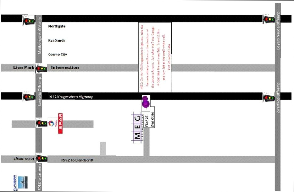 Name of Company: MEG ProductionsPhysical Address:Plot 26, Elandsdrift, Lanseria,1747Postal Address: P.O. Box 2805, Honeydew, 2040GPS Co-ordinates: S25.58.155 / E27 54.080 Telephone Number: 011 659-7003 Fax Number : 086 537 3797